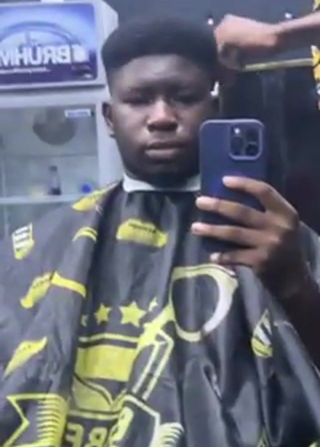 A young man sits in a barber's chair, holding a phone and taking a selfie, while a barber cuts his hair with clippers