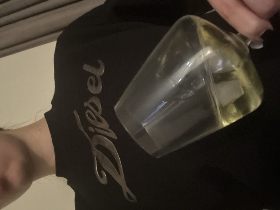 A person is holding a wine glass filled with a light-colored liquid, likely wine or juice. The glass is angled slightly to the right. The person is wearing a black t-shirt with a silver "Diesel" logo. The background is blurred and indistinct, but suggests an indoor setting with light-colored walls or blinds. Part of the person's face and neck are visible. The image is close-up and focuses on the glass and the clothing.