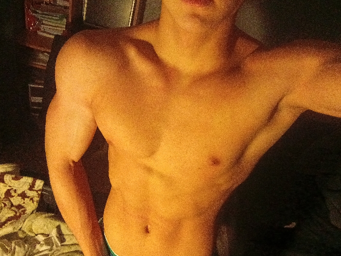 A tanned, fit man's upper body is featured. His bare chest and arms show some muscle definition, particularly in the biceps and pectoral region. One arm is raised slightly. A bed with patterned linens is visible in the lower left corner of the frame, with a shelf holding books behind. The background is largely dark, drawing attention to the brightly lit physique.