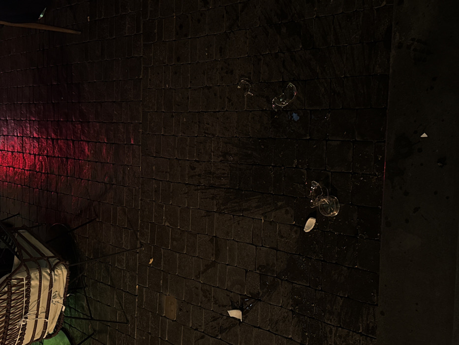 The image depicts a dark, wet paved outdoor area, likely a cafe or restaurant patio, in Yerevan, Armenia. The ground is composed of dark rectangular paving stones, reflecting a prominent red light from an external source in the upper portion of the frame. In the upper-left quadrant, a section of an outdoor chair with a woven, light-colored cushioned seat is visible. Scattered across the wet pavement are multiple fragments of a shattered glass vessel, including a distinct stem and base section. Also present are several small, scattered white paper fragments and a small blue foreign object. An irregular dark, wet stain on the paving stones indicates a liquid spill associated with the broken glass. No individuals are present in the scene.