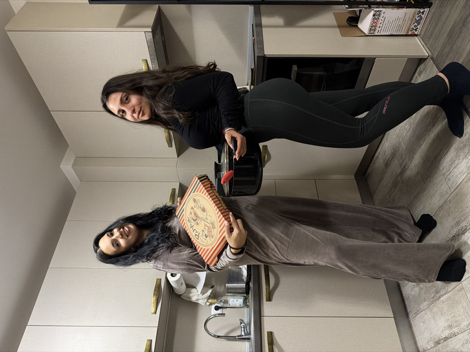 Two adult females are standing side-by-side in a modern kitchen located in Sofia, Bulgaria. The female on the left, with long dark hair, is smiling and wearing a light brown velvet tracksuit with black socks. She holds a rectangular pizza box featuring "Пица Рина" (Pizza Rina) branding with a red and white striped pattern and cartoon illustration. The female on the right, also with long dark hair and a slight smile, wears a black long-sleeved top, black "ONLY PLAY" brand athletic leggings, and dark blue socks. She holds a black cooking pot with a glass lid and a red-handled utensil. The kitchen features light beige upper and lower cabinets with gold-colored bar handles, light grey countertops, and a light-toned tiled floor. A stainless steel sink with a chrome gooseneck faucet, paper towel dispenser, and various bottles are visible on the left countertop. A built-in cooktop, stainless steel range hood, and a dark-fronted oven or dishwasher are visible on the right.