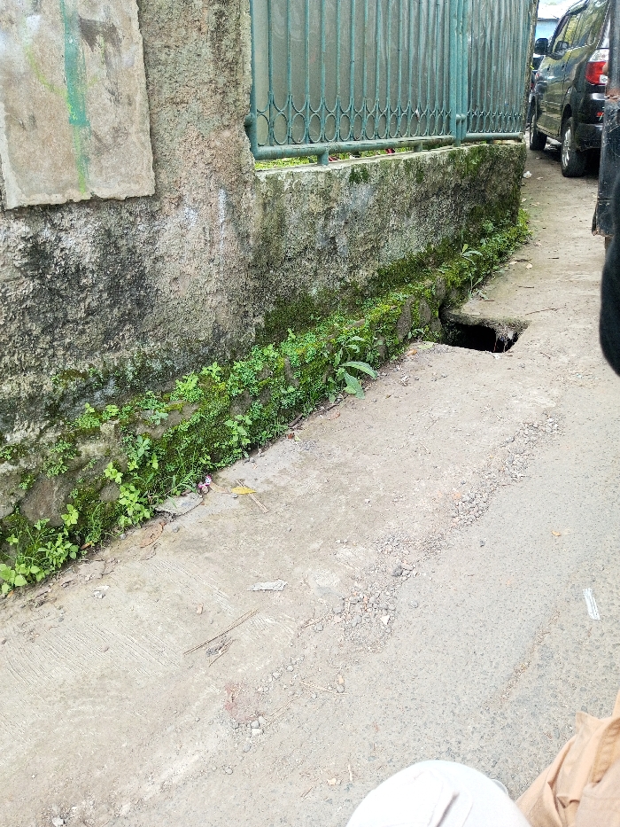 The scene depicts a narrow paved pathway alongside a weathered concrete wall in Vieng Phouka, Laos. The concrete wall, heavily stained with moss and small green plants, runs along the left side of the frame. Above the wall, a green metal fence with decorative circular patterns is visible. A rectangular, lighter-colored slab is partially affixed to the upper portion of the concrete wall on the left. At the base of the wall, near the pathway, a square-shaped opening, likely a drain, is cut into the pavement. The pathway itself is made of concrete and asphalt, showing signs of wear with scattered gravel and debris. In the background, beyond the fence and further down the path, a dark-colored vehicle, possibly an SUV, is parked. The lower right foreground reveals a partial view of a person's leg clad in light trousers and a brown fabric, suggesting the perspective of an observer standing on the pathway. No direct human interaction is depicted.