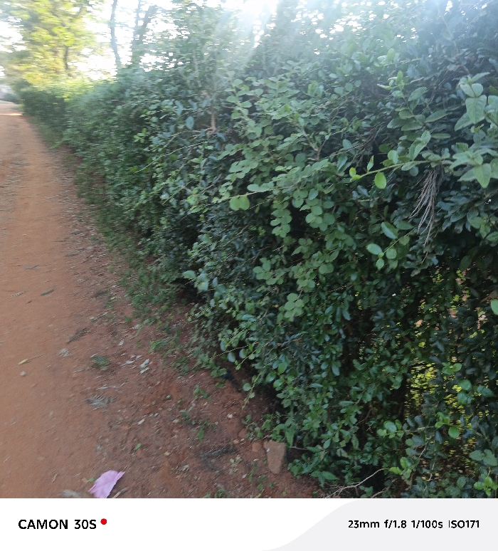 A long, green hedge lines a reddish-brown dirt path. The dense foliage is thick and lush, with sunlight dappling through the leaves. The path appears to stretch into the distance alongside the hedge, vanishing around a bend. Hints of trees are visible beyond the hedge. A small piece of pink trash lies on the ground near the path's edge. The image is taken with a CAMON 30S camera.