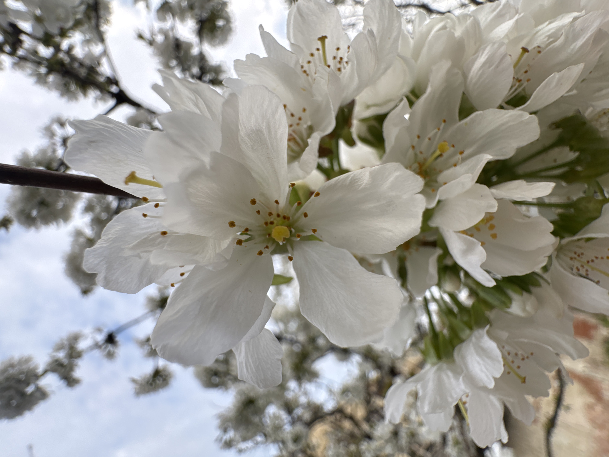 - "A close-up shot of white blossoms against a partly cloudy sky and other out-of-focus blossoms" by FM-aQtHq2, licensed under CC BY 4.0