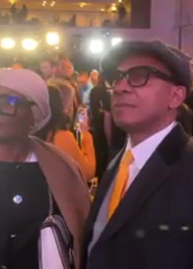 man and a woman standing in a crowded room. The man is wearing a black suit, a yellow tie, glasses, and a gray newsboy cap. The woman is wearing a black dress, a tan coat, glasses, and a headscarf. They are both looking up at something. There are many people in the background, some of whom are taking pictures. The room is brightly lit and has a high ceiling.