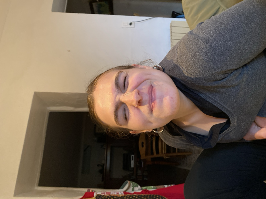 A female individual is centrally positioned in a medium-shot, facing forward with her head tilted slightly to the right. Her eyes are tightly closed, her nose is wrinkled, and her lips are pursed, indicating a strong facial contraction. She has light brown hair, a silver stud in her left nostril, and silver hoop earrings. She is wearing a grey long-sleeved V-neck top over a darker, possibly black, garment. Her left arm is visible across her lower torso, and she wears dark pants. The background consists of a light-colored wall. To the subject's left, a section of patterned red and white fabric is partially visible. Behind this, a dark rectangular doorway leads to an interior room, which is dimly lit. Inside this room, a wooden chair with a slatted back and dark furniture are discernible. To the subject's right, a white electrical outlet with a black plug is mounted on the wall. Below this, a white radiator with vertical fins is partially visible. A segment of a framed picture or artwork hangs on the far right wall, and a green cushion or piece of furniture is present in the lower right corner. The scene is indoors, with direct lighting on the subject and lower ambient light in the background. The specific location within the city of Roussillon, France, cannot be determined from the visual information provided.