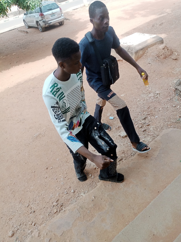 The scene depicts two young males on an unpaved, reddish-brown dirt surface in Tudun Nupawa, Nigeria, adjacent to a concrete step