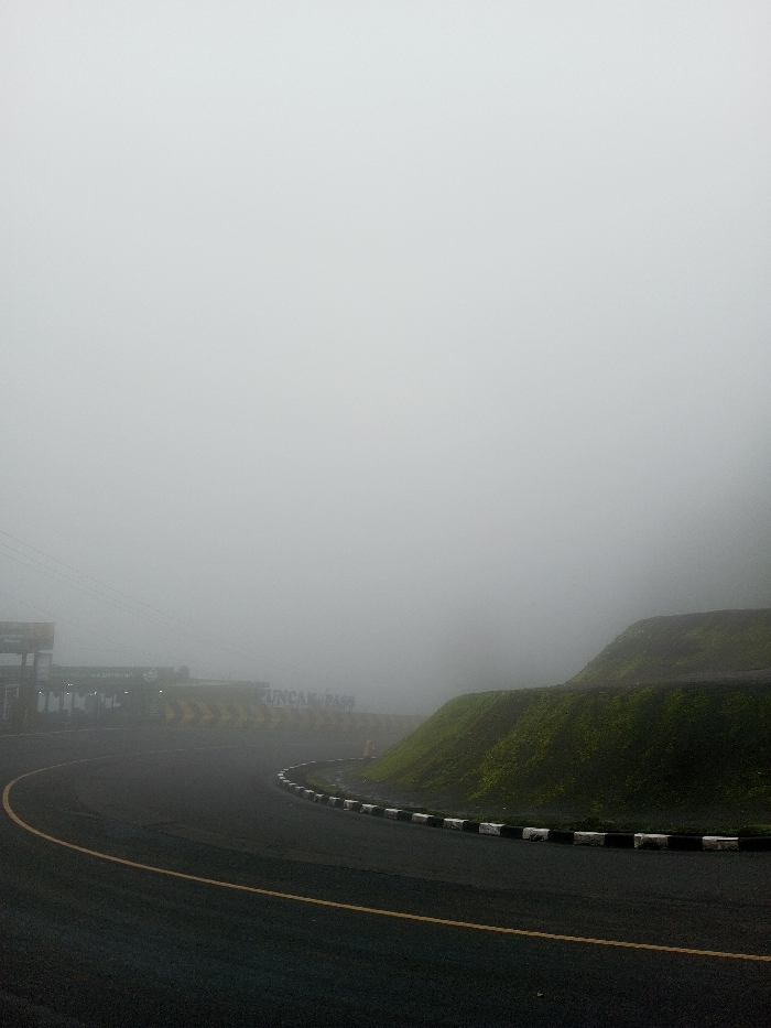 A winding road curves through thick fog, hugging a grassy hillside to the right. The road is marked with a yellow line, and a black and white curb separates it from the hill. In the distance, blurred by the fog, are structures and signs including one reading "Puncak Pass". Visibility is extremely limited, suggesting a potentially dangerous driving condition. The scene has a monochromatic, atmospheric feel.