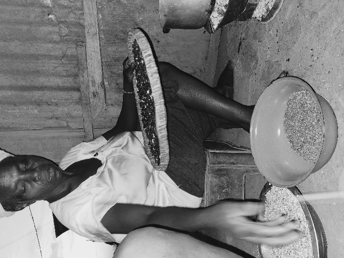 A person sits, presumably indoors with corrugated walls overhead. They hold a flat, round tray filled with dark seeds or beans. Next to them is a large bowl of lighter-colored grains. The person's hands are active, suggesting a process of sorting or preparing the grains, as some of the grains are shown in another bowl on the ground. The overall scene suggests an agricultural or food preparation task is being undertaken, possibly winnowing or cleaning grains.