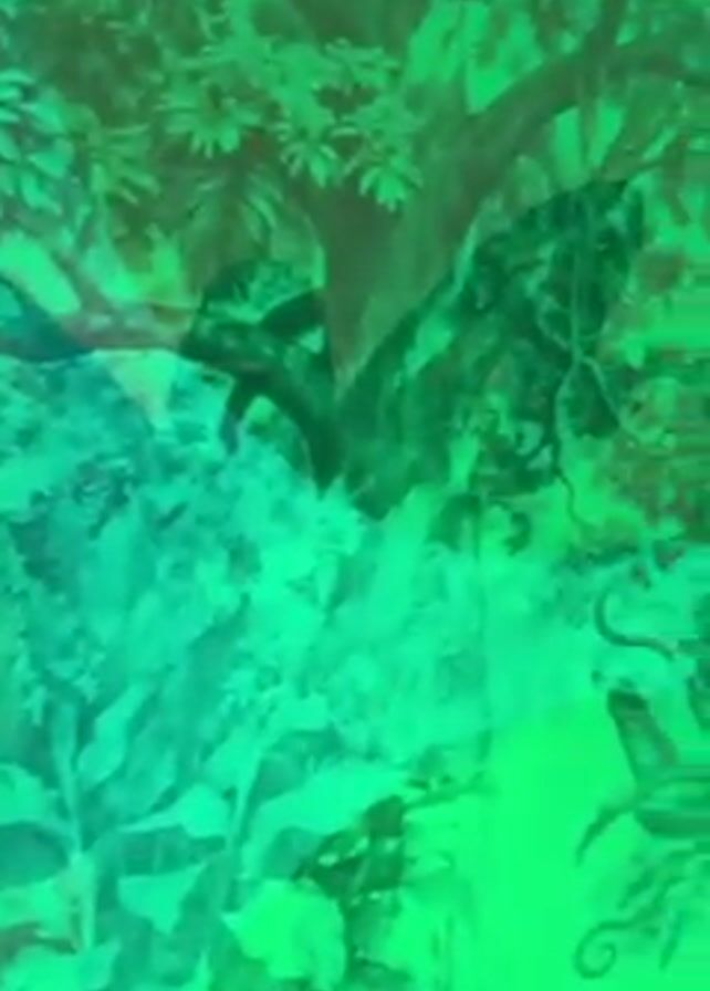 room with a jungle-themed mural covering the walls. The mural features trees, plants, and animals. The room is lit with changing colors, including green, red, and purple. The floor also appears to have a mural. Some of the animals depicted in the mural are a rhinoceros and a bird with wings. The lighting and mural create a surreal and immersive atmosphere.