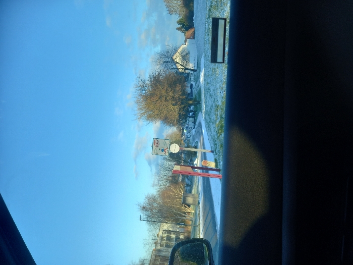 The image presents a static outdoor scene captured from within a vehicle, looking through a side window