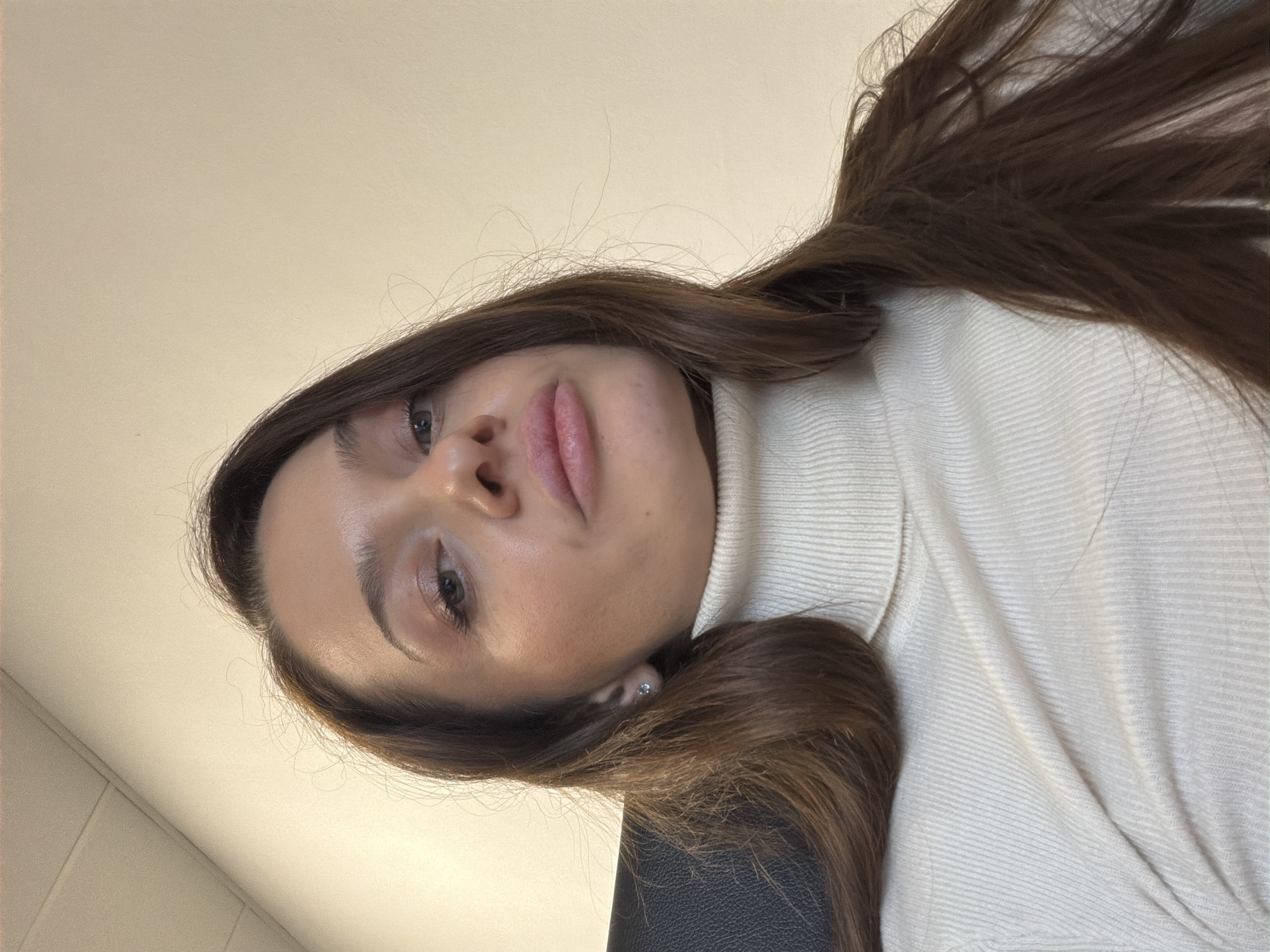 A close-up, low-angle portrait photograph captures a single female individual indoors. The subject, an adult female with long, dark brown hair cascading over her shoulders and chest, occupies the majority of the frame. She exhibits fair skin and wears a light-colored, ribbed turtleneck sweater, appearing off-white or cream. A small, circular, silver-toned stud earring is visible in her right earlobe. Her lips are pursed, and her eyes, with visible makeup application, are directed towards the camera. Behind her left shoulder, a section of a dark-colored, likely black, upholstered chair backrest is discernible. The background features a plain, light-toned wall, while a portion of a white suspended ceiling with a visible grid and a light fixture is present in the upper left quadrant. The precise location within the city of Varna, Bulgaria, cannot be determined from the visual information provided in this image.