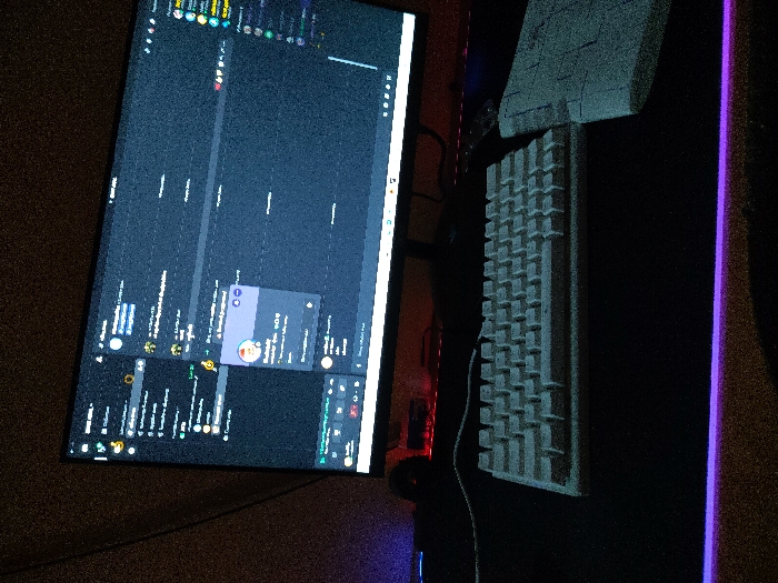 The image displays a computer workstation located in a dimly lit interior. A large computer monitor, in a dark theme, prominently displays the Discord application interface, featuring chat channels, user lists, and an open user profile pop-up. Positioned on a dark gaming mousepad are a compact, light-colored mechanical keyboard and a matching light-colored wrist rest to its right. A purple RGB LED strip illuminates the bottom edge of the mousepad, while a red light emanates from behind the monitor, casting a glow on a partially visible white object with red internal lighting, possibly a computer tower. No individuals are visible. The specific location within Krushare, Bulgaria, cannot be determined from the visual information provided.