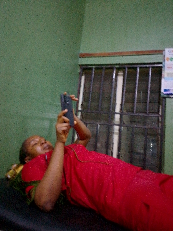 An individual, appearing female, with short dark hair, is positioned supine on a dark-colored surface, likely a bed or examination table. Her head rests on a patterned cushion. She wears a red, possibly shimmering, garment. A green and yellow patterned fabric is visible near her left shoulder beneath the red garment. Both hands hold a dark-colored smartphone elevated above her chest, with her gaze directed towards its screen. The immediate environment consists of dark green painted walls. A window with dark metal security bars is visible on the right side of the image; a brown wooden trim runs horizontally above it. A partially visible white rectangular object, potentially a poster or calendar displaying "GN" text and colorful graphics, is affixed to the wall near the upper right corner of the window. The scene is located in the city of Unknown, Unknown.