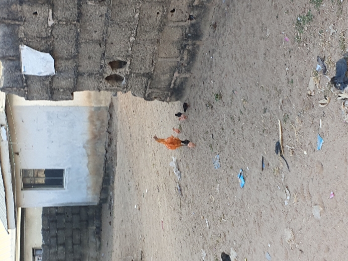 The image depicts an outdoor scene in Lokoja, Nigeria, under natural daylight. The ground consists of unpaved, light-brown sandy soil, scattered with various pieces of litter including blue and white plastic wrappers, other small plastic fragments, a dark elongated object (possibly rubber or hose), and a lighter irregular object. No people are visible. An adult reddish-orange hen walks on the sandy surface, accompanied by at least five chicks of varying colors, from light yellow to dark grey/black, clustered near her. In the background, to the left, a light-colored building with a dark-framed window and a light-colored roof is present; its lower wall exhibits discoloration. To the right, a prominent, weathered dark-grey concrete block wall stands, featuring two distinct circular holes and an irregular white sheet material affixed to its upper right section.
