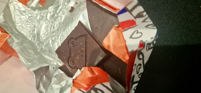 - "An open chocolate bar with a silver wrapper, orange interior lining, and outer white paper casing with black heart designs and red accents is partially visible" by FM-DaNa73, licensed under CC BY 4.0
