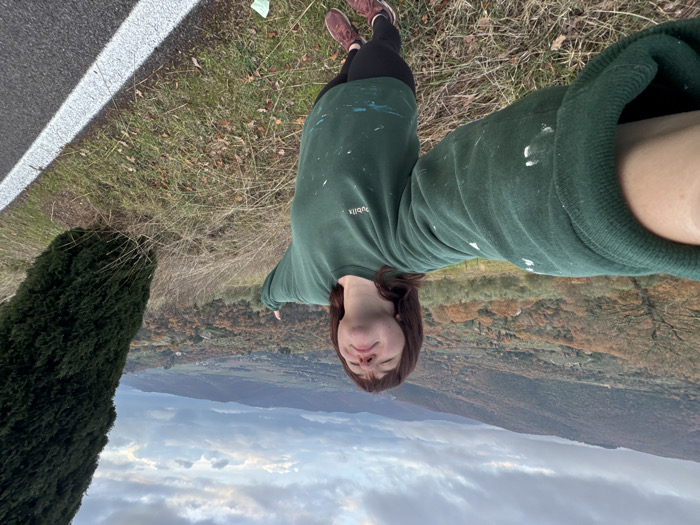 An upside-down selfie shows a woman in a green sweatshirt with white paint splatters, standing on grassy terrain