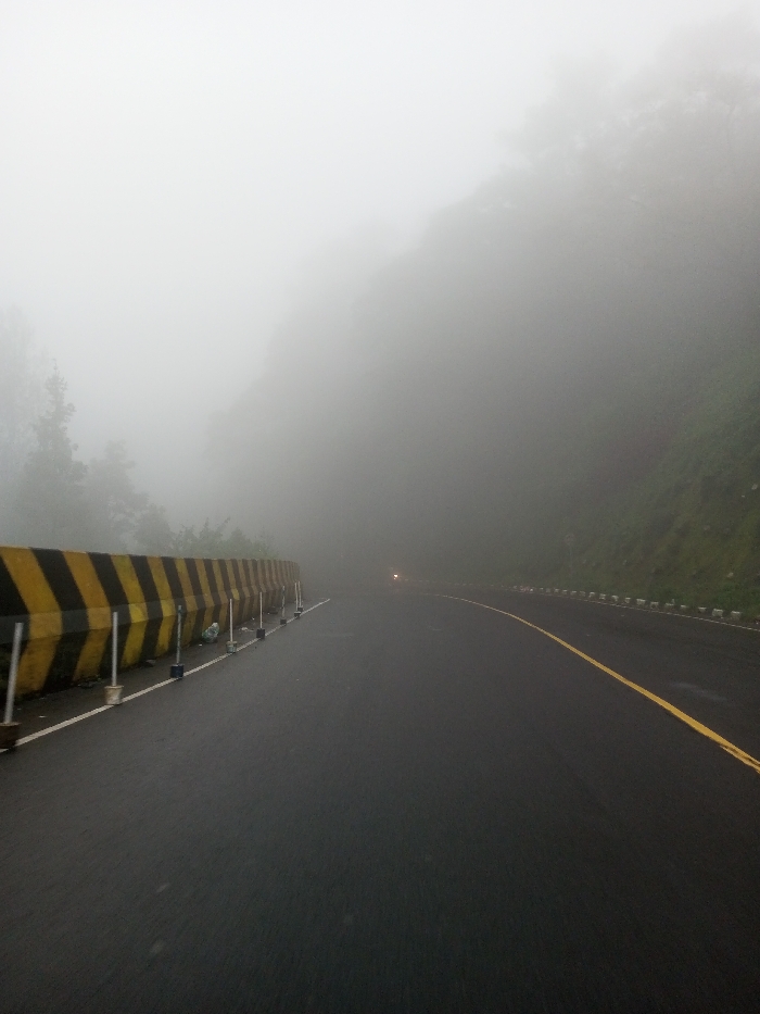 The image depicts a foggy mountain road in Dawathang_Dorjibi_ Kashingtsawa, Bhutan
