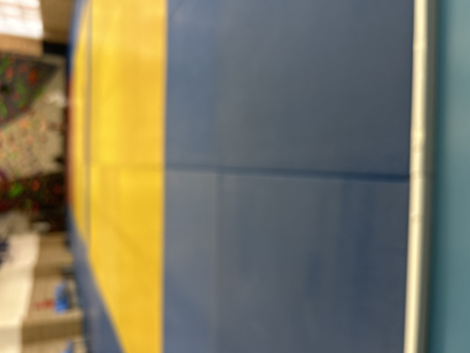 The image depicts the interior of a sports facility in Sliven, Bulgaria. In the foreground, a metallic horizontal bar is visible at the bottom edge, resting on a light blue surface. The midground is dominated by a large mat composed of two distinct horizontal sections: a darker blue segment in the lower half and a bright yellow segment in the upper half, with visible seams indicating individual mat pieces. The background is significantly out of focus but reveals structural elements including light-colored pillars to the left and a climbing wall on the right adorned with numerous colorful holds. A white ceiling is partially visible above the climbing wall. No individuals or specific actions are discernible within the frame.