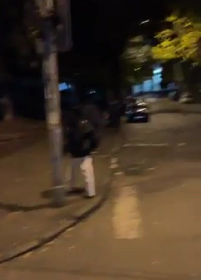 street scene at night. The camera moves from a close-up of a street sign to a wider view of the street. There are parked cars on both sides of the street. In the distance, a group of people can be seen gathered in front of a white building. Several people are walking on the street, including one who is running toward the group. The scene is lit by streetlights and car headlights. There are trees lining the street. The video appears to be shaky, as if taken while moving.