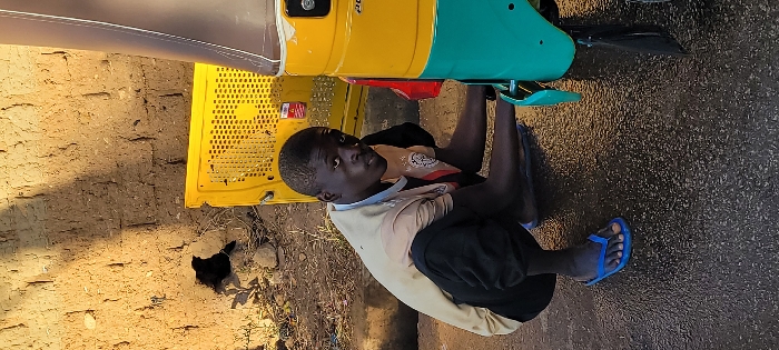 A man kneels beneath a three-wheeled vehicle painted yellow and turquoise. He is dark-skinned, wearing a light shirt and dark pants, with blue sandals on his feet. The vehicle's chassis is visible above him. To the left, a yellow crate rests against a wall, and a small black animal is near the wall's base. To the right, the ground appears to be paved.