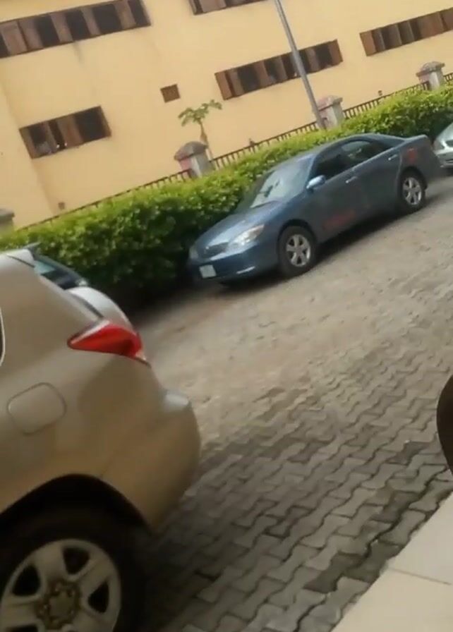 n outdoor scene with three cars parked on a cobblestone driveway. The closest car to the viewer is gold, with its rear end visible. To the right of it is a blue car with a red design on the side. Behind the blue car is a silver car. A hedge separates the cars from a light yellow building with brown-framed windows. A tall light pole stands near the building. Part of a chair or other furniture is visible in the bottom right corner of the frame. A brief, indistinct conversation can be heard. The camera appears to be held indoors and slightly tilted.