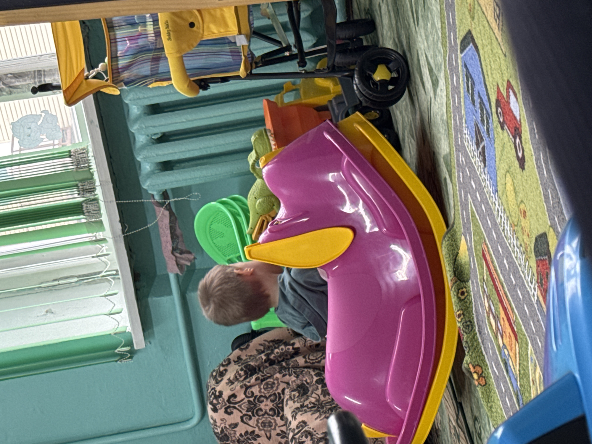 room with a variety of objects. There are toys including a rocking horse, green colanders, and what appears to be a toy stroller. There is a person in the room. There is a patterned rug on the floor that features a road design. The room has a window with blinds. While the location can not be confirmed without additional information, it is stated that the city is Anapa, Russia.