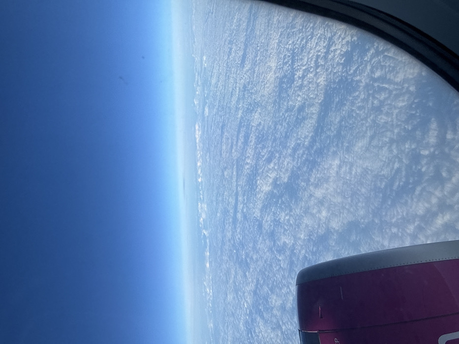 - "An aerial view from an aircraft window shows a dense, expansive layer of white clouds extending to a distant horizon under a clear blue sky" by FM-WTNcz2, licensed under CC BY 4.0