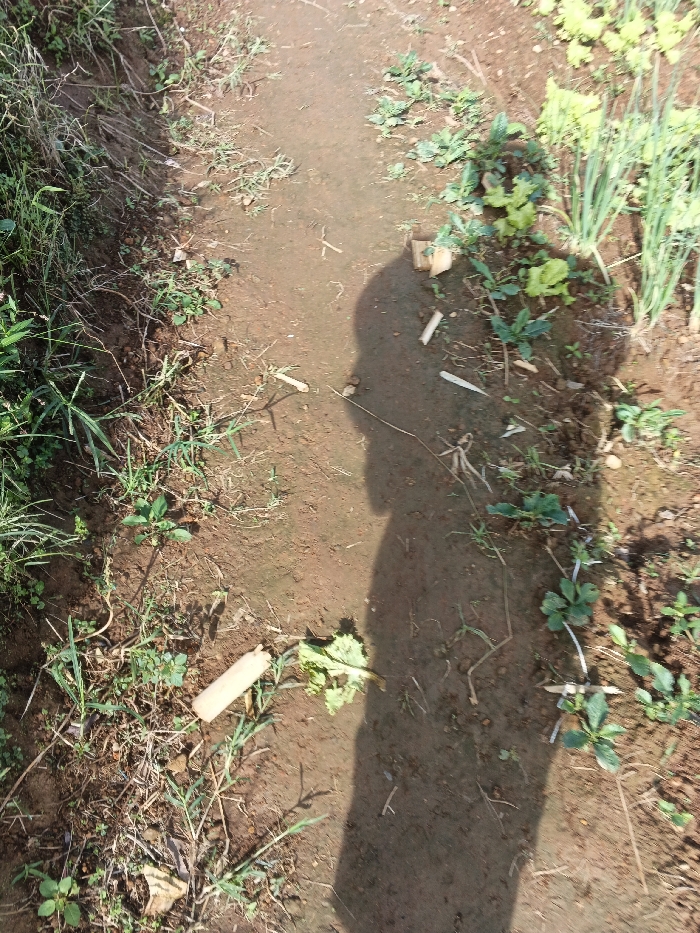 A narrow dirt path separates a small cultivated area. To the left of the path, dense green vegetation grows along the edge. To the right, scattered plants, including lettuce and onions, are visible. Litter, such as pieces of cardboard or plant trimmings, is strewn along the path and amongst the plants. The shadow of a person dominates the center of the image, obscuring the ground. The lighting suggests a sunny day.