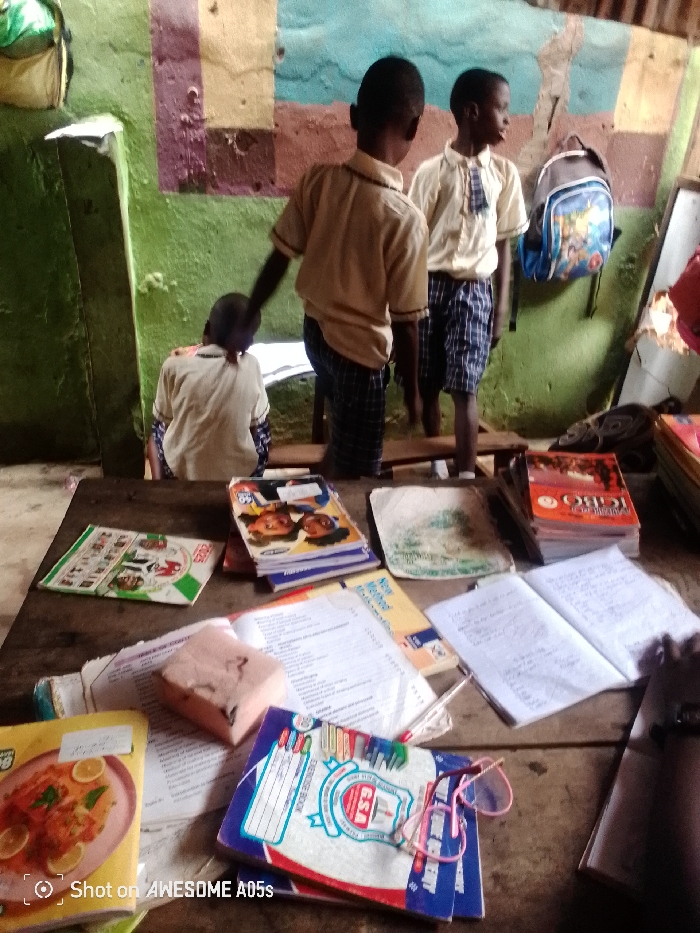 The image displays an indoor scene featuring three young male children in uniform, likely within a classroom or study area located in the city of Unknown, Unknown. Two boys are standing towards the center-right, one partially obscured by the other, both wearing light-colored short-sleeved shirts and plaid shorts; one of them also has a blue tie. A third boy is seated with his back to the camera on the left. The background wall exhibits a multi-colored, distressed surface with sections of green, light blue, purple, and brown paint. A blue and grey backpack with cartoon illustrations hangs on the right wall, while a light-colored bag hangs on the left. The foreground consists of a wooden table cluttered with numerous textbooks and exercise books, some open to handwritten pages. Visible book titles include "IGBO," "New Method," and "Grade 60." A pink, rectangular sponge-like object rests on an open book, and a pair of pink-framed glasses is placed on another exercise book, next to a pen or pencil. The scene suggests an active learning environment.
