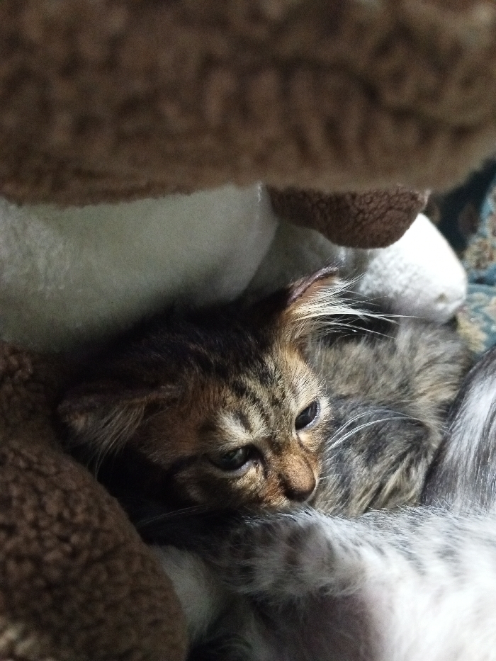 An interior scene in Viengkham, Laos, depicts a domestic kitten resting among soft furnishings. The subject is a small, medium-haired feline with a brown and black tabby pattern, featuring lighter grey fur on its underbelly and prominent white whiskers. Its eyes are partially open, cast downwards and to the right. The kitten is nestled between several plush objects: a large, dark brown, textured fabric mass dominates the top portion of the frame, partially covering a lighter, off-white plush item. Another greyish-white plush object is visible to the right and behind the kitten. A patterned fabric, featuring shades of blue and brown, is visible in the lower right, partially beneath the kitten. The kitten is in a recumbent position, appearing to be asleep or at rest within this enclosed, soft environment.