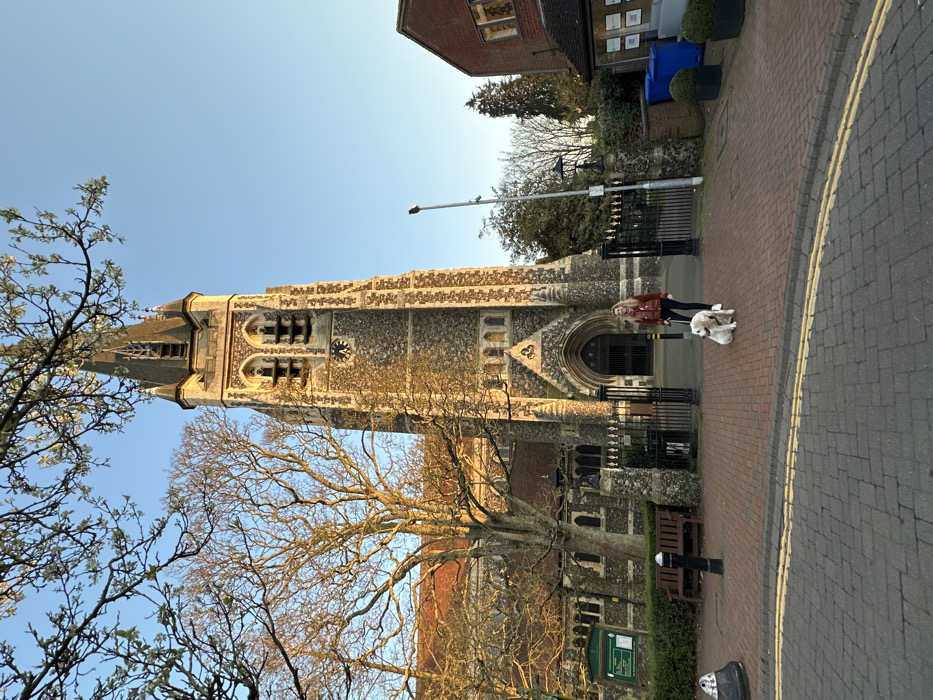 The image captures a late afternoon scene in front of St. Thomas of Canterbury Church in Brentwood, United Kingdom. The prominent stone Gothic Revival church, featuring a tall tower with a spire and a visible clock face, is bathed in warm, directional sunlight, casting long shadows. On the reddish-brown brick-paved area directly in front of the church's black metal gates, a blonde female individual, wearing a brown jacket, dark trousers, and white athletic shoes, stands holding a white leash in her right hand. Beside her, to her left, a large white-furred dog is seated calmly, facing towards the viewer. To the left of the church entrance, within the churchyard, a dark wooden bench, a green information board, and a large, bare deciduous tree are visible. The lower foreground shows a cobblestone street marked with double yellow lines. To the right of the scene, part of a brick building, a tall black lamppost, two blue wheelie bins, and two potted topiary plants are present. The sky above is clear and light blue, with branches bearing new foliage or blossoms extending into the upper left of the frame.