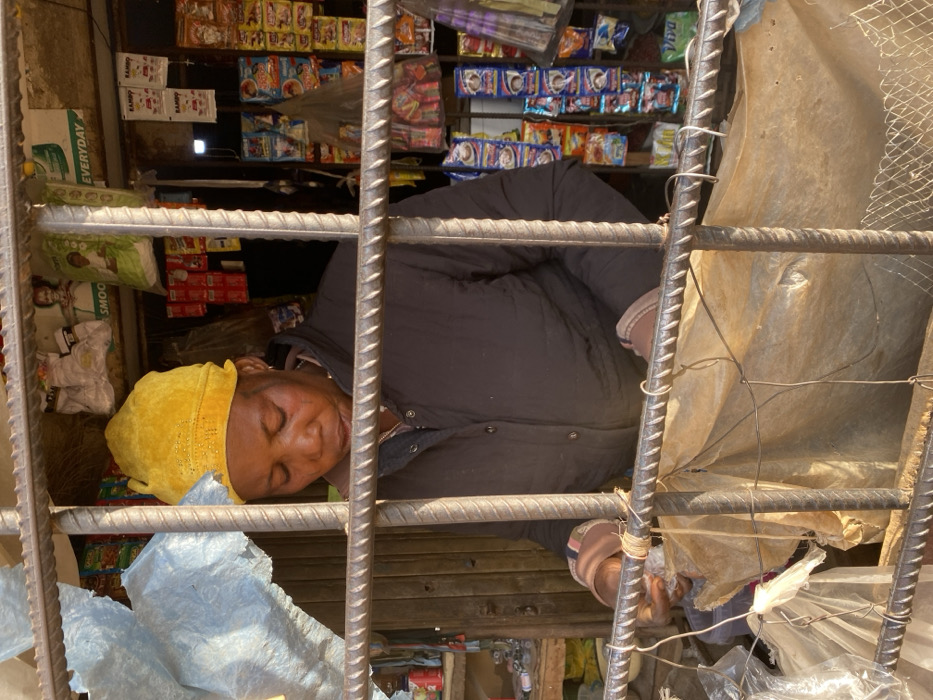 A woman with a yellow headscarf is sleeping inside a shop with a barred metal gate. The shelves behind her are stocked with various packaged goods. The metal bars of the gate obscure a clear view of the scene, and a weathered plastic sheet and wire mesh are attached to the gate. The woman's closed eyes and relaxed posture indicate she is asleep. The shop appears small and crammed with merchandise.