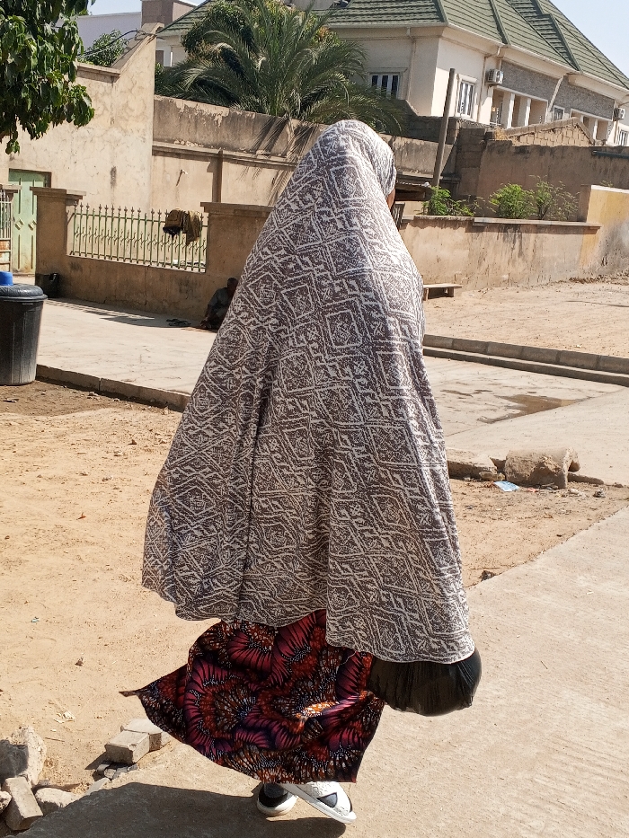 The image captures a street scene in Tarauni, Nigeria, under bright, clear daylight. A primary subject, viewed from the rear, is positioned centrally and appears to be walking on a concrete path. This individual wears a full-length, light brown and white geometrically patterned outer garment. Beneath this, a vibrant skirt or dress with a red, purple, and black floral or abstract pattern is visible, along with white and black athletic sneakers on their feet. To the left of the frame, in the foreground, a black cylindrical trash bin is partially visible. Behind the main subject, the ground consists of a dry, sandy-colored dirt path with sections of concrete paving. A green metal fence with decorative scrollwork runs horizontally across the mid-ground. Behind this fence, to the left, a second individual is seated on the ground or a low surface, dressed in dark attire, with a pair of dark sandals placed nearby. The background features several light-colored residential buildings with weathered concrete or stucco facades. One building exhibits a dark green tiled roof, and multiple window types are visible, some accompanied by external air conditioning units. Sparse vegetation, including palm fronds and green foliage, is present behind and between the structures. Small, broken concrete pieces and debris are scattered across the dirt ground in the foreground and mid-ground.