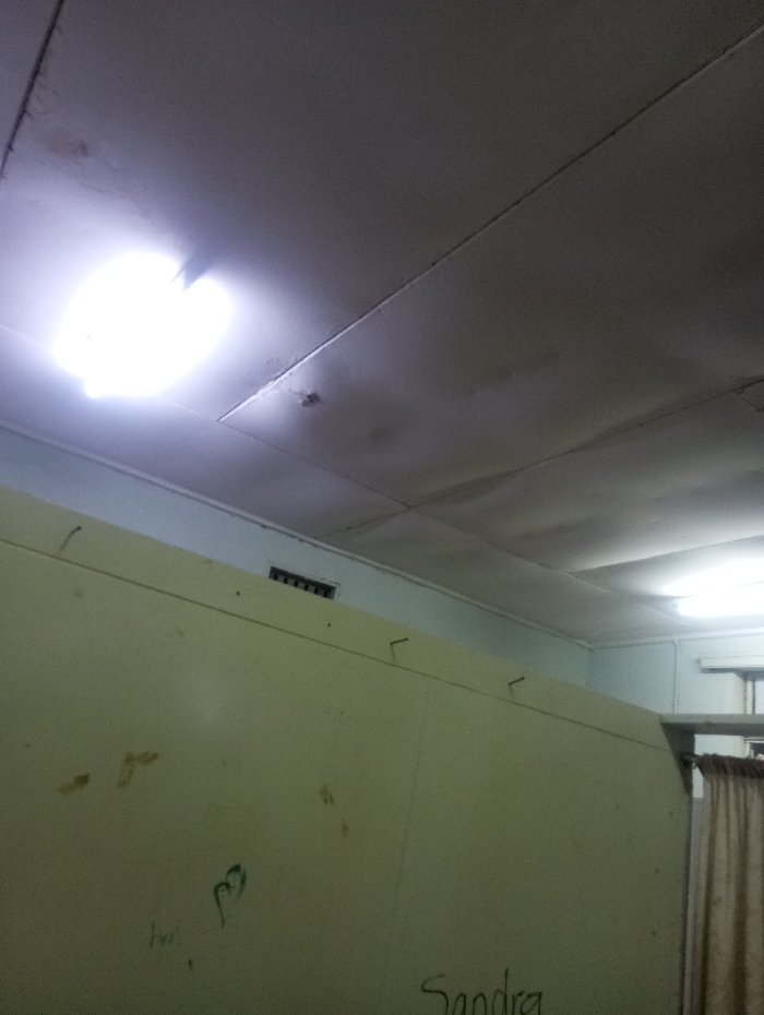 A low-angle shot reveals a room interior. The ceiling consists of tiled panels with two bright lights, one prominently positioned on the left. Below, a pale green wall with graffiti including the name "Sandra" is visible. A dark vent sits above the wall. A glimpse of a curtain near a window is on the right of the frame. The room is lit dimly.