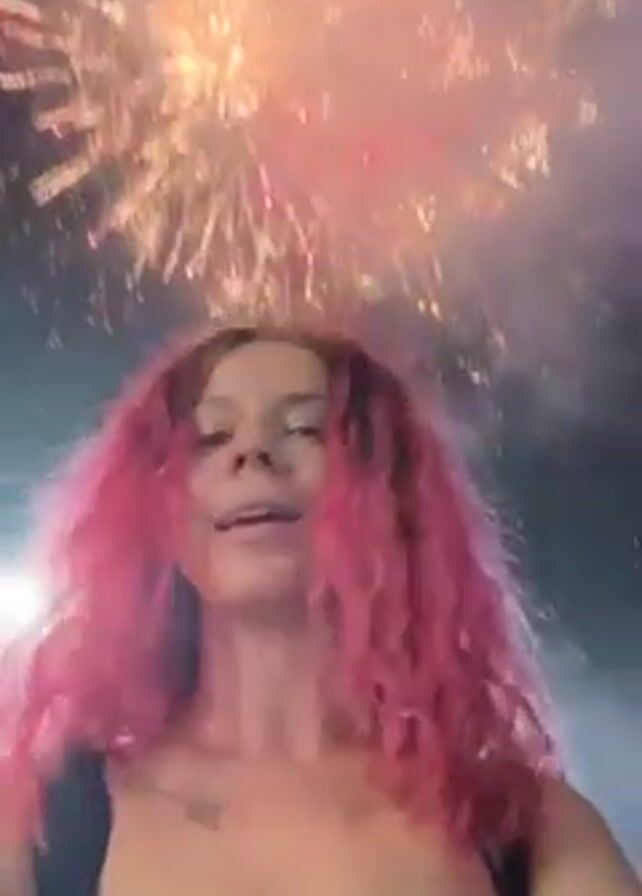 A woman with shoulder-length, curly, pink hair is looking directly at the camera while fireworks explode behind her. She is wearing a black, low-cut tank top. The fireworks are colorful, including red, white, yellow, green, and blue. The woman smiles slightly and opens her mouth in a small gasp. The scene appears to be outdoors at night.