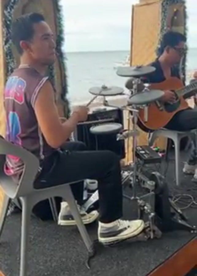 band performing on a small platform near the ocean. The band consists of three men: a drummer wearing a basketball jersey and black pants, a guitarist wearing a black shirt and black pants, and a singer wearing a floral shirt and jeans. The drummer is seated at a small drum kit, the guitarist is seated and playing an acoustic guitar, and the singer is seated and singing into a microphone. The platform is decorated with Christmas garlands and is surrounded by wicker furniture. The ocean is visible in the background with a boat out on the water, and the sky is overcast.