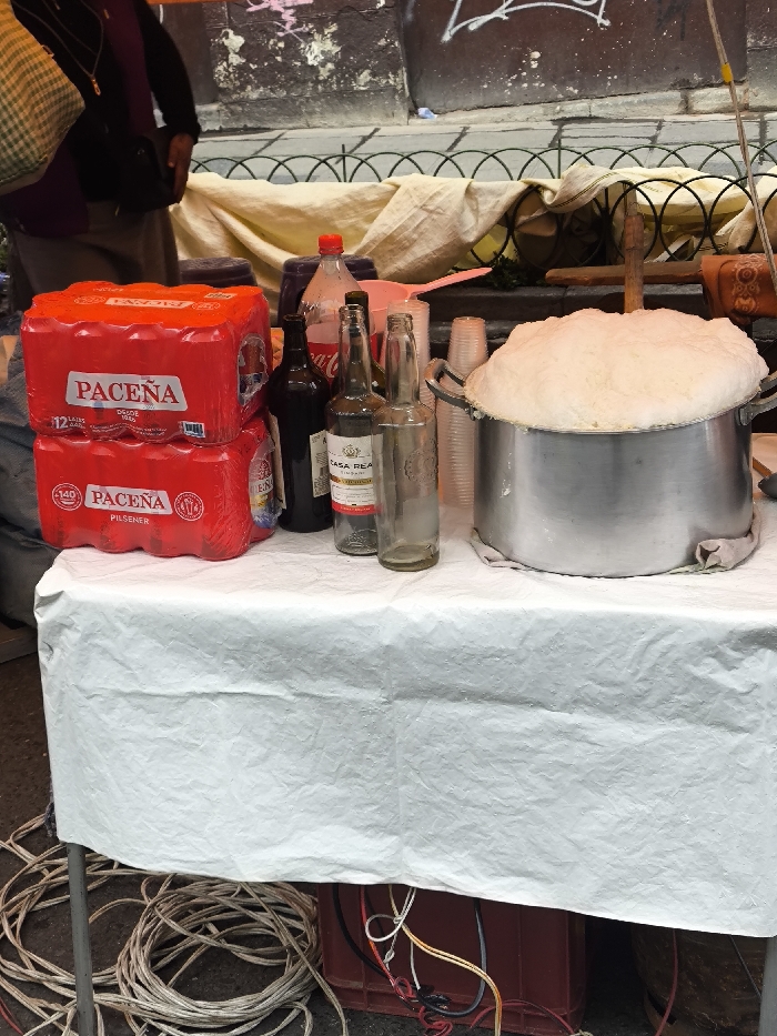 A makeshift street vendor's table, draped with a white cloth, displays an eclectic assortment of items. Two red plastic packages of "Pacena" beer sit beside bottles of spirits and Coca-Cola. A large, dented aluminum pot, overflowing with a frothy, white substance, dominates the scene. Plastic cups are stacked nearby, suggesting a beverage for sale. Cords and wires tangle beneath the table, hinting at the informal nature of the setup.