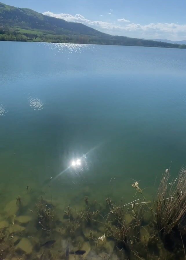 scenic view of a lake on a sunny day, with mountains visible in the background. The camera focuses on the clear water near the edge of the lake, revealing several fish swimming among aquatic plants and rocks. The reflection of the sun creates a bright spot on the water's surface. The camera also shows a set of metal stairs leading down to the water.