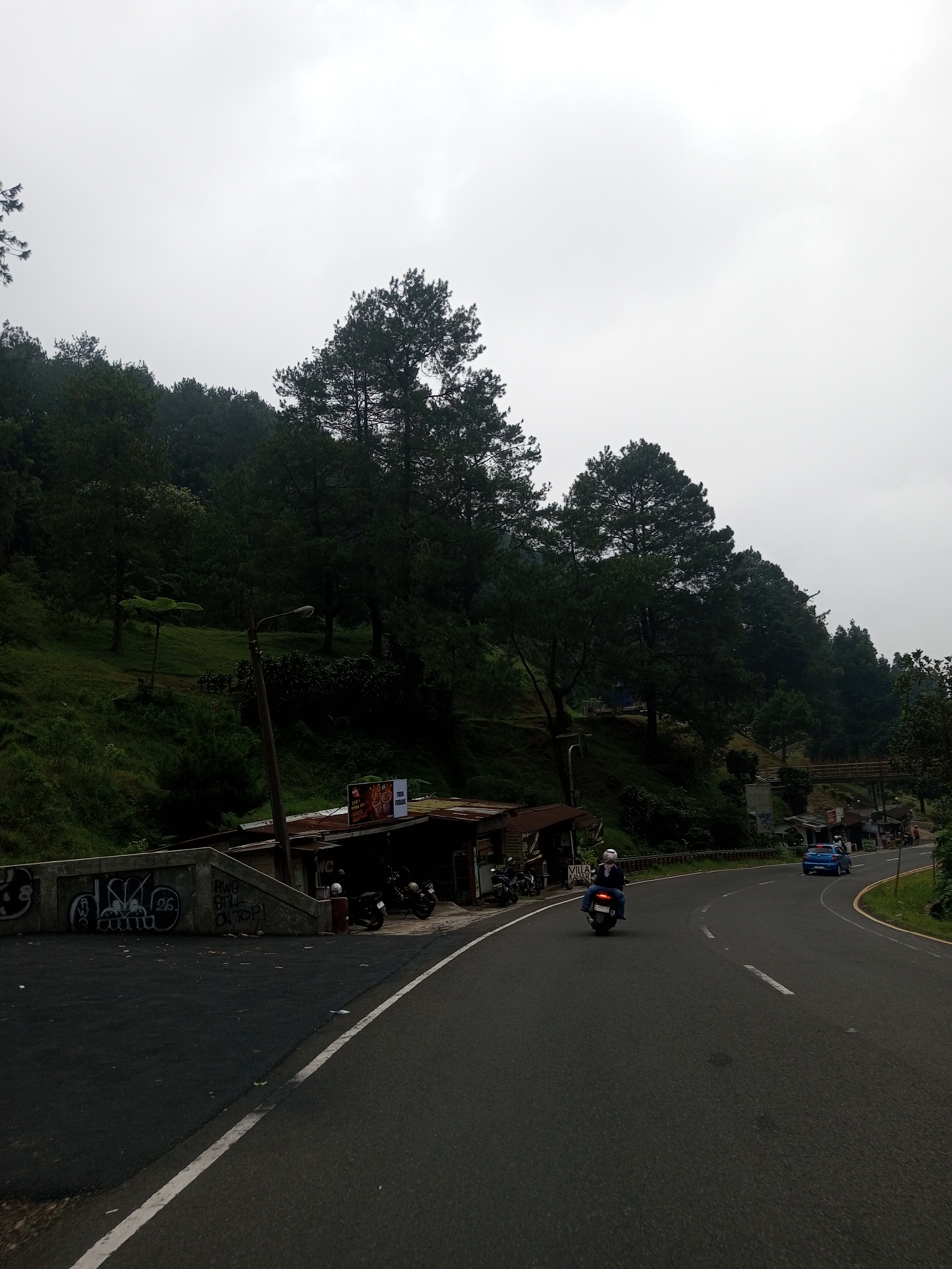 The image depicts a road winding through a hilly, forested landscape. A motorcyclist and a blue car are traveling along the road. A cluster of small shops or stalls sits adjacent to the road. Above, a hillside is covered with trees and green vegetation. The sky is overcast and gray. Graffiti is visible on a concrete structure beside the road. The setting appears to be in a rural or semi-rural area. The location given is the city of Mae Chan District, Thailand, but there is no specific information in the image to prove this location.