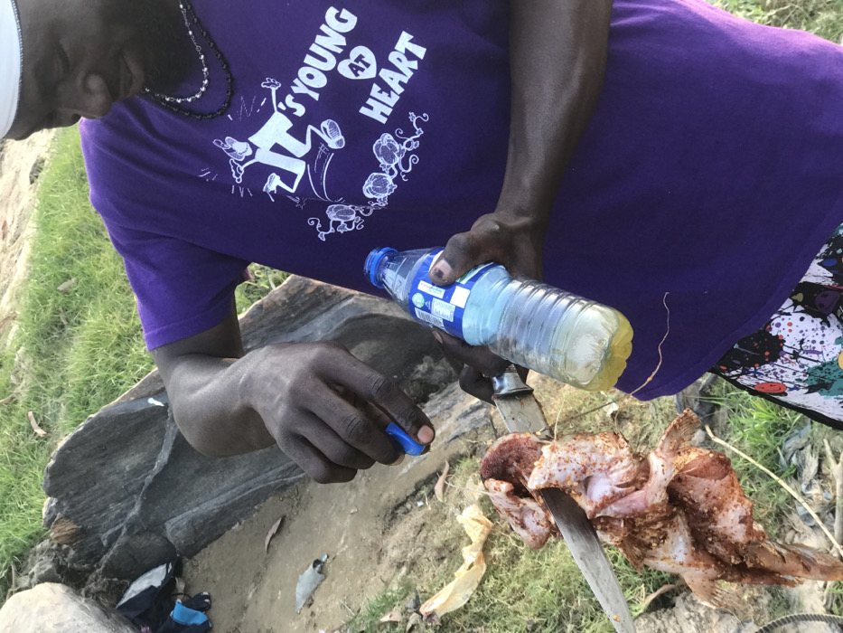 A person wearing a purple shirt with the words "It's Young At Heart" is shown holding a water bottle and a skewer with a fish. The person is likely cooking the fish as evidenced by the skewer and the bottle. The person is standing in an outdoor setting, as seen by the grass and dirt in the background.