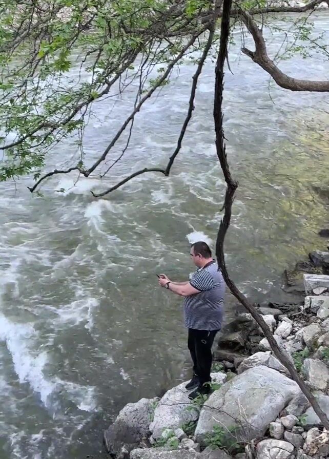 A man wearing a striped shirt and dark pants stands on a rocky bank next to a rapidly flowing river. He is holding a mobile phone and appears to be taking a photo or video of the river. Overhanging branches from a tree frame the scene. The river water is turbulent and white, indicating a strong current. The bank is lined with rocks and some green vegetation.