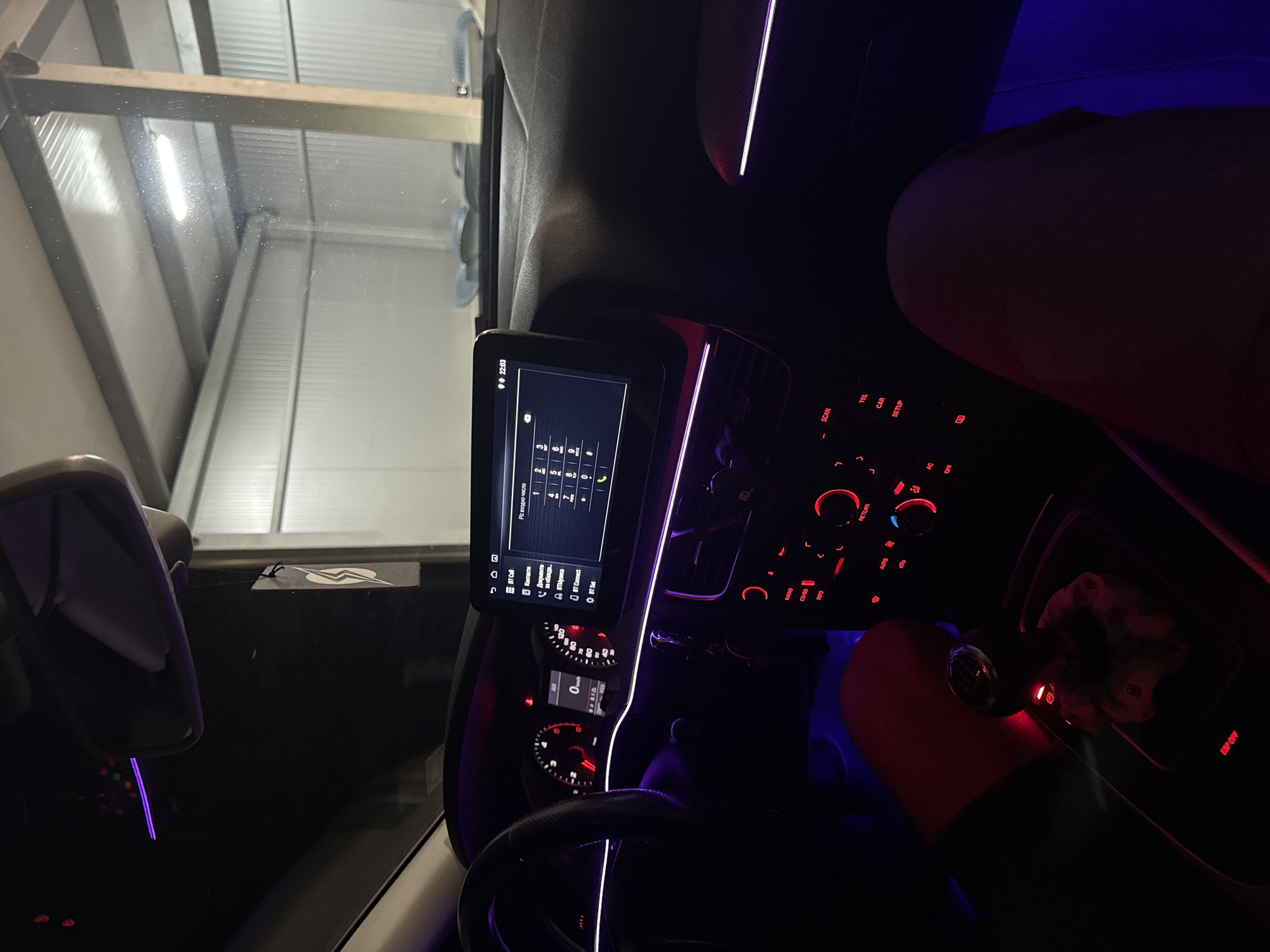 The interior of a car is captured in a dimly lit, upside-down photograph. Visible within the car's interior is the dashboard, steering wheel, infotainment screen, and center console with gear shift. The infotainment screen displays a numerical interface with a 22:03 timestamp. Buttons labeled "RADIO," "CD/SD," "INFO," "AUTO," "RETURN," "AC OFF," "SCAN," "TEL," "CAR," and "SETUP" are illuminated on the dashboard. The steering wheel features a white LED strip. Purple LEDs accent the edges of the dashboard and infotainment screen. Outside of the vehicle, a structure made of corrugated metal panels is visible through the windshield. The image does not contain any information about the location in Zlataritsa, Bulgaria, people, interactions, or actions.