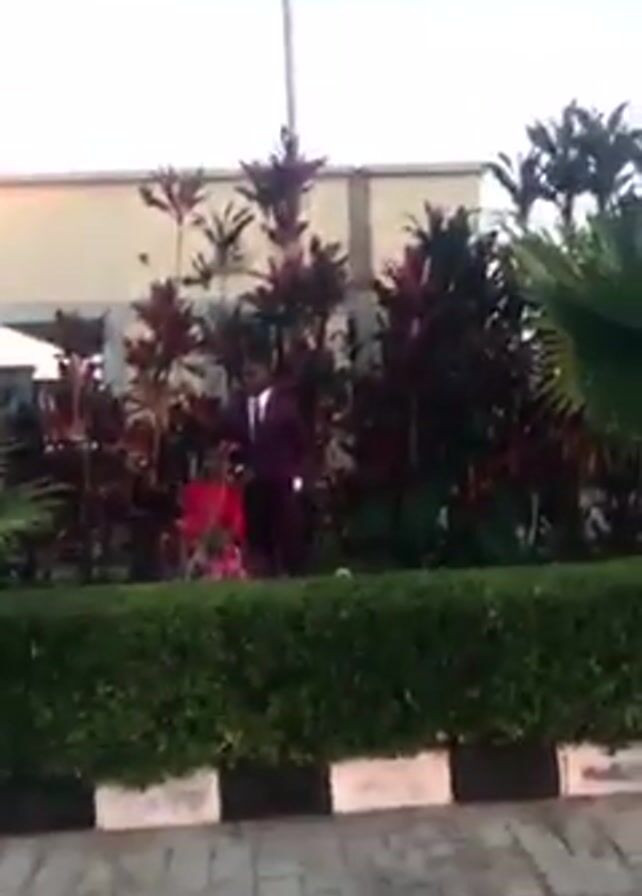 The video begins with a ground-level view of a paved walkway bordered by a hedge. The camera pans up to reveal a man in a dark suit standing near a woman in a red and floral outfit, both positioned near a hedge. The hedge is trimmed to be a neat rectangle. Behind the hedge are various plants with red and green leaves. A security camera mounted on a pole is visible in the background. A photographer can be seen on the left with photography equipment. The photographer is instructing the man and woman in the video.