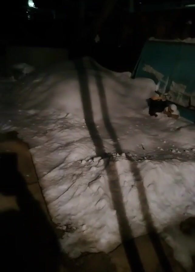 The video is shot at night and features a snowy outdoor scene. The camera moves forward along a snow-covered path. To the right, there is a large pile of snow next to what appears to be a dumpster or storage container. There are a few indistinct objects near the dumpster. As the camera moves, it passes a wooden table on the left. The overall lighting is poor, with the scene illuminated primarily by a distant light source, casting long shadows of the person holding the camera. The details are hard to make out due to the darkness.