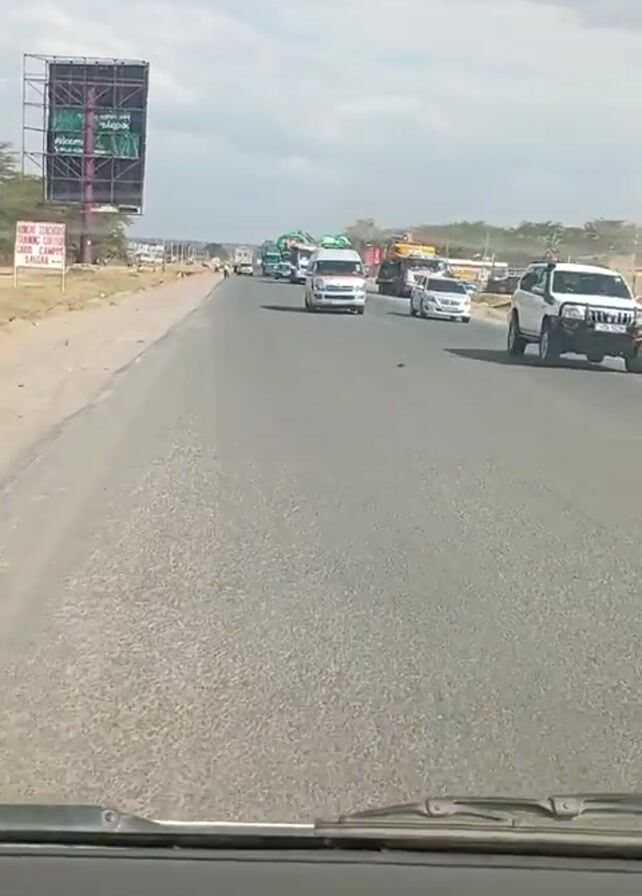 The view from inside a car driving on a highway. The road is straight with light traffic including cars, vans, and large trucks. There is a billboard on the left side of the road with text on it. The sky is partly cloudy.