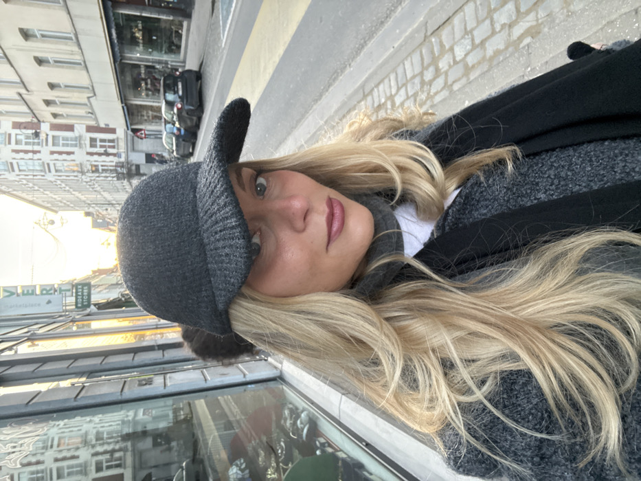An adult female is depicted in a medium close-up, standing on a city sidewalk in Brussels, Belgium. She wears a dark grey knitted cap with a brim, a dark grey turtleneck, a white undergarment, a textured dark grey overcoat, and a black scarf. Her long, wavy blonde hair frames her face. She has visible eye makeup and dark pink lipstick, looking directly towards the camera. To the subject's left, a building with large glass windows reflects elements of the street and sky. A green vertical sign is partially visible directly above her head and in the reflection, displaying "VERT" at the top and "RIDEAUX STORES" (Curtain Stores) below. To the subject's right, a cobblestone sidewalk borders an asphalt street with yellow lane markings. Multiple parked cars, including black and dark blue vehicles, are visible on the street. Multi-story buildings with traditional European architecture, featuring windows and facades in white and brick tones, line the street in the background. The scene is illuminated by low-angle natural light, suggesting either sunrise or sunset.