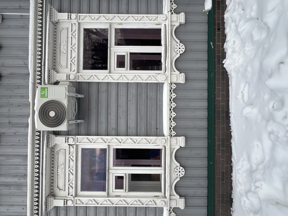 An exterior view reveals two adjacent windows encased in ornate white frames with decorative detailing. A modern air conditioning unit is mounted between the windows on the gray wood-paneled wall. A narrow brick pathway runs alongside the building, bordered by a substantial pile of snow. The composition suggests a contrast between traditional architectural elements and modern amenities against a winter backdrop.