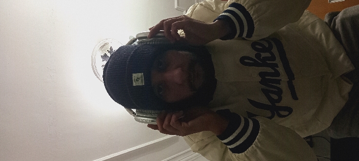 A person wearing a navy beanie, headphones, and a tan jacket with "Yankees" written in blue script is centered. The person is positioned at an angle, facing the camera. The background includes a white wall with a ceiling fan. The lighting appears to be indoor and artificial. The overall composition gives the impression of a casual self-portrait.