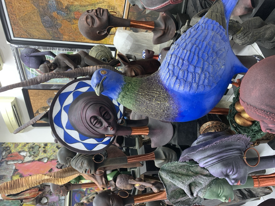 This image depicts an indoor art gallery or studio located in Ikate, Nigeria. The foreground is dominated by a large, upright sculpture of a bird, predominantly bright blue with green coloring on its neck and upper chest. Surrounding the bird and extending into the midground is a dense collection of diverse sculptures, primarily dark-toned (browns, blacks, grays) and featuring metallic copper or gold accents. These sculptures include numerous busts of figures, many depicting African women with stylized faces, elongated necks, elaborate headwraps, and hoop earrings. One prominent bust features a circular headdress with a blue and white geometric pattern. Other sculptures include a male figure carrying an object, animal heads, and textured, abstract pieces, such as one resembling a nest with golden eggs. In the background, multiple framed paintings with abstract or figural designs in varied colors are visible on white walls. An air conditioning unit is mounted high on the left wall. The lighting suggests an interior, artificially lit environment.